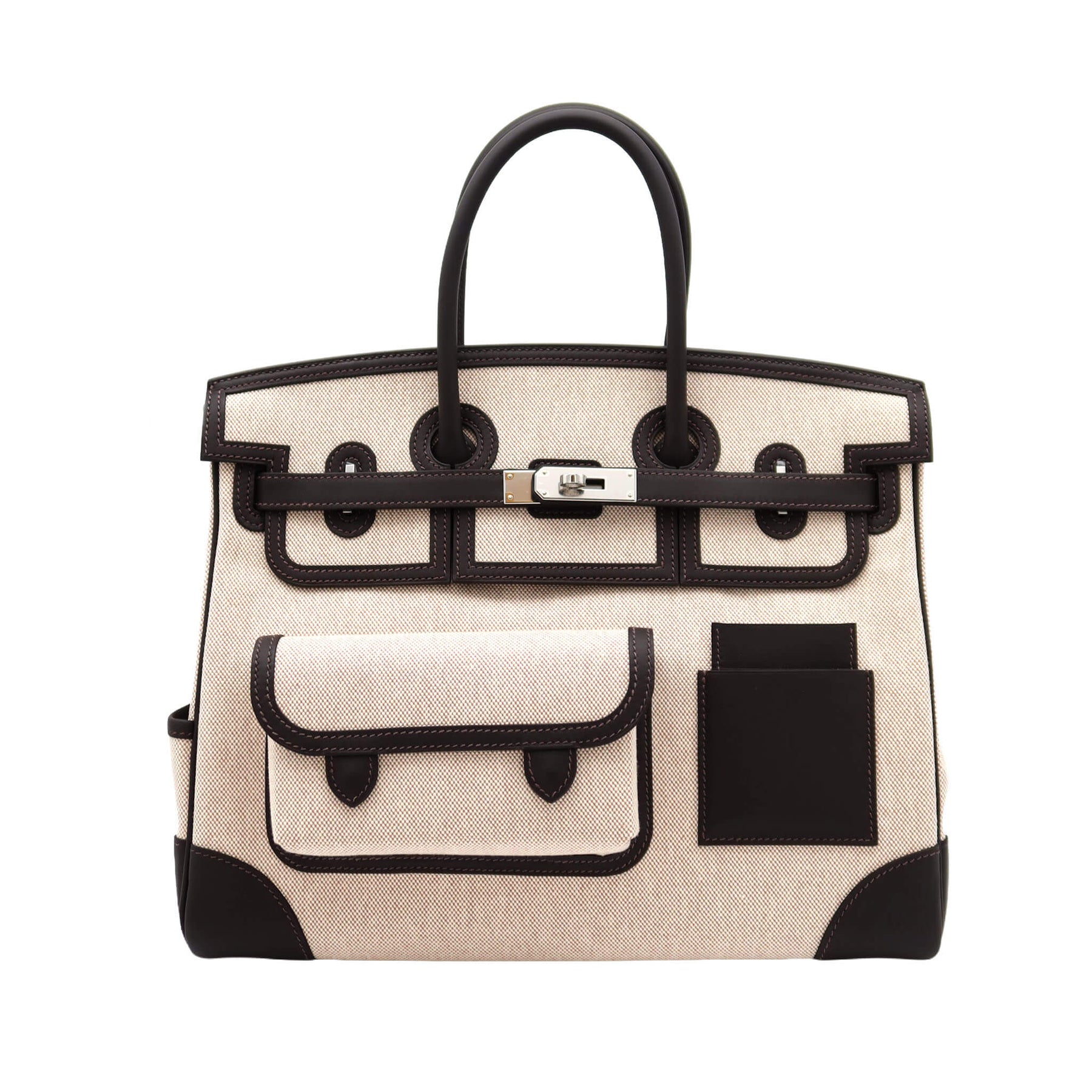 エルメスのバーキン35 カーゴ。バイブルンのスイフト/トワル素材にシルバー金具を組み合わせた、機能性のあるモデルです。